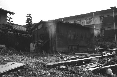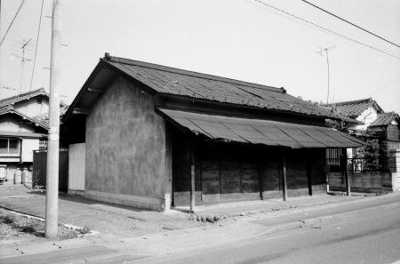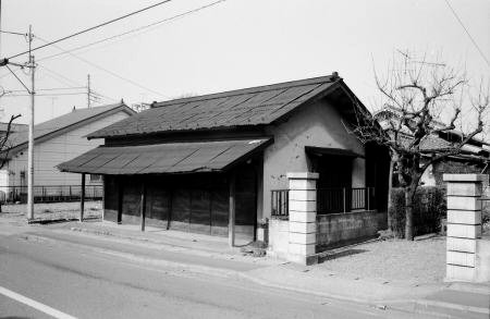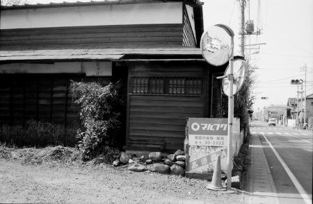 H12年(2000年)、4月、ベッサR、35ミリ、箱根ヶ崎近辺の町の風景、1、2枚目は同じ家で空き家のような感じがする、せりだした大きな庇が謎