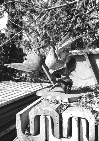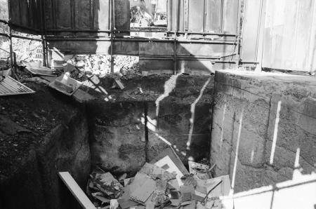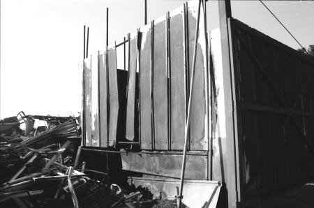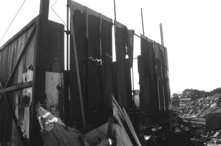 箱根ヶ崎付近のかなり広いエリアの建築解体現場風景、箱根ヶ崎駅周辺の区画整理事業か?、多摩モノレールに上北台~箱根ヶ崎間に延伸計画がある(2030年年代半ば開業予定)、1枚目はたぶん手作りの焼却炉、2枚目は、鳥のはく製の置物、3~5枚目は、建築解体の鉄板の覆い 。撮影日時、カメラ等データー不明。