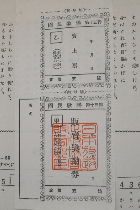 を島崎藤村の作詞で作曲している。本屋の販売売上票と販売奨励券が添付されていた。定価 五銭 とある。