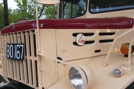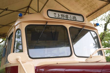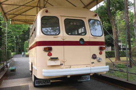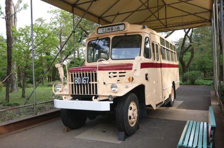 都営バス路線仕様に模様替えしたいすゞのボンネットバス、1947年(S49年)製造の型式はTSD43、元々は航空自衛隊の1979年製の4輪駆動トラックシャーシーに福山自動車時計博物館(広島県福山市)の依頼により、北村製作所でボンネット車体に換装して復元したもので、福山自動車時計博物館から借り受けて展示されている。行先の表示は上野広小路、方向指示器はよく見えないが、4枚目左端下、収納矢羽根式、1カ月に一度性能維持のためか園内を走行するとか(ユーチューブ等で動画あり)。以前は乗客を乗せての遊園走行をしていたが今はしていない。 一時期、映画の撮影用に当時の都営バスのグレーとグリーンの混色に塗装されていたが、今はクリーム色に再塗装されている。 DA640型ディーゼルエンジン、6,37L、130ps/2600rpm、41、5kgm/140prm |