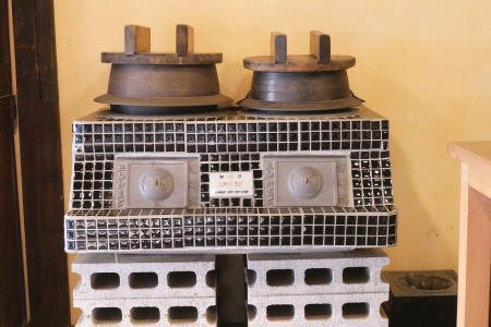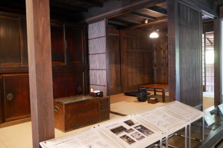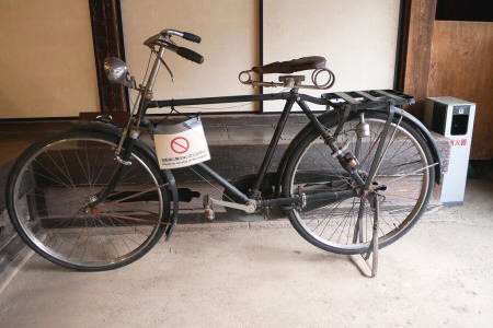 万徳旅館、青梅市西分町/江戸時代末期~明治時代初期、建物は創建当時に近い姿に、室内は旅館として営業していた1950年(昭和25)頃を復元している。二枚目、越中富山の家庭常備薬の箱が置かれている、三枚目、三和かまど、炊飯、湯沸かし、煮炊きに使われた。5枚目の自転車はKENT号(日米富士自転車製造)